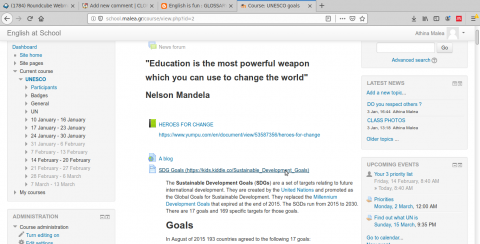 Submitted by malea on Sat, 02/29/2020 - 12:49 My 6th graders have access in a Moodle platform in order to learn about United Nations, the SDG goals until 2030, to get to know about Activists and fighting for rights all over the world.